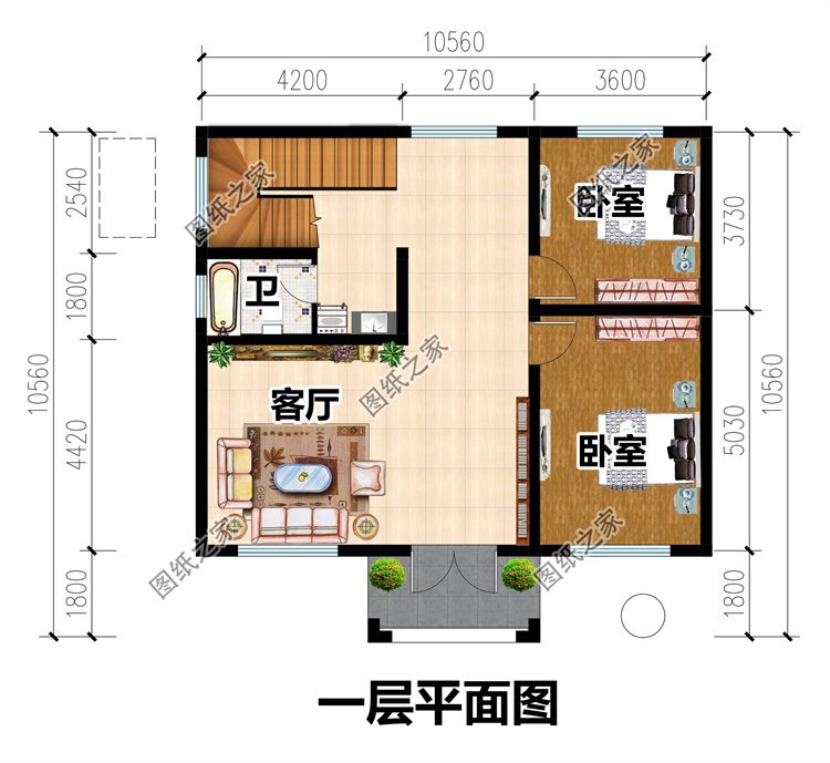 一層戶型:客廳、臥室x2、衛生間;