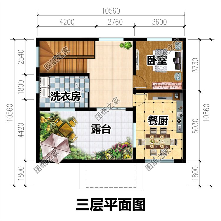 三層戶型:臥室、廚房、餐廳、洗衣房、露臺;