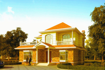140平二層帶閣樓別墅設(shè)計方案圖,外觀圖片色彩明快