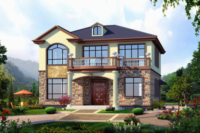 140平二層帶閣樓別墅設計方案圖,外觀圖片色彩明快
