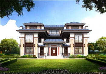 大氣新中式三層雙拼別墅設計圖及外觀,總面寬20米多